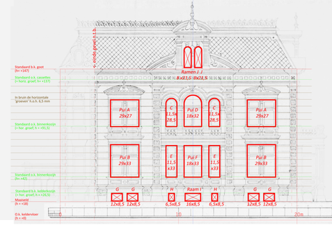 Een kopie van de oorspronkelijke tekening uit 1895 van de verbouwing tot villa, met daarop de door mij ingetekende merken van de 3D prints.