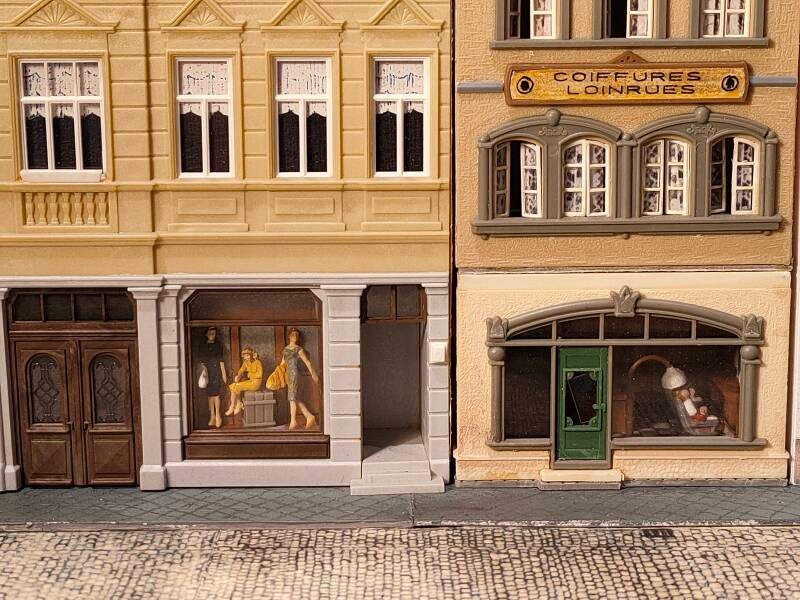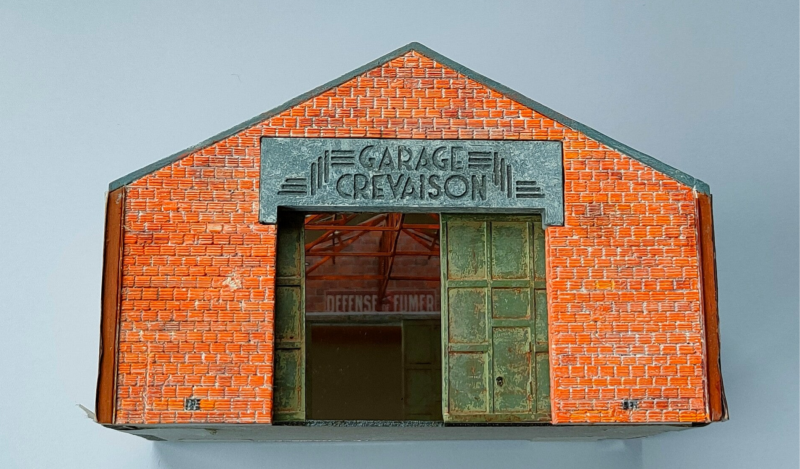 In 2023 some of the standard building kits of the old module have also been replaced by home made constructions, like the garage above. (N.B. Crevaison is French for a flat tire). This is a half relief building; the back wall is a mirror. So the text Defense de fumer (No smoking) in fact is printed as a mirror image on the back of the front wall. Because of the mirror the interior of the building looks twice as deep as it realy is.