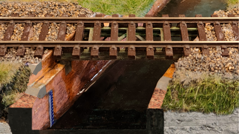 Op de X-module ligt een kleine haven. Voor het overstekende spoor is dit stalen vakwerkbruggetje gelijmd uit losse polystyreen strips, met een bruggenhoofd van karton met geprinte bakstenen. Nu de rails er overheen liggen zie je het alleen vrijwel niet meer ;-). Ballast en begrassing zijn van Wouter Timpener.