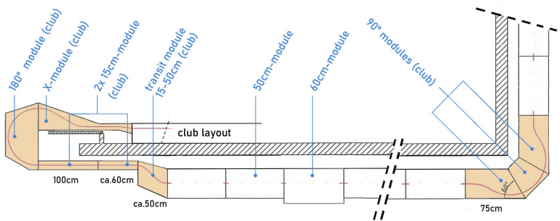 De clubmodules (beige) met daartussen de standaardmodules van de leden. De rode lijn is het verloop van het hoofdspoor over de modules. Binnen de modules is het verloop van het spoor in principe vrij.