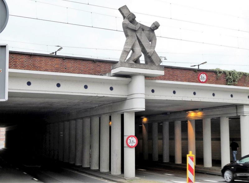 Links het model van het beeld (nog ongeschilderd) en rechts een foto van de echte Europatunnel in Hengelo.