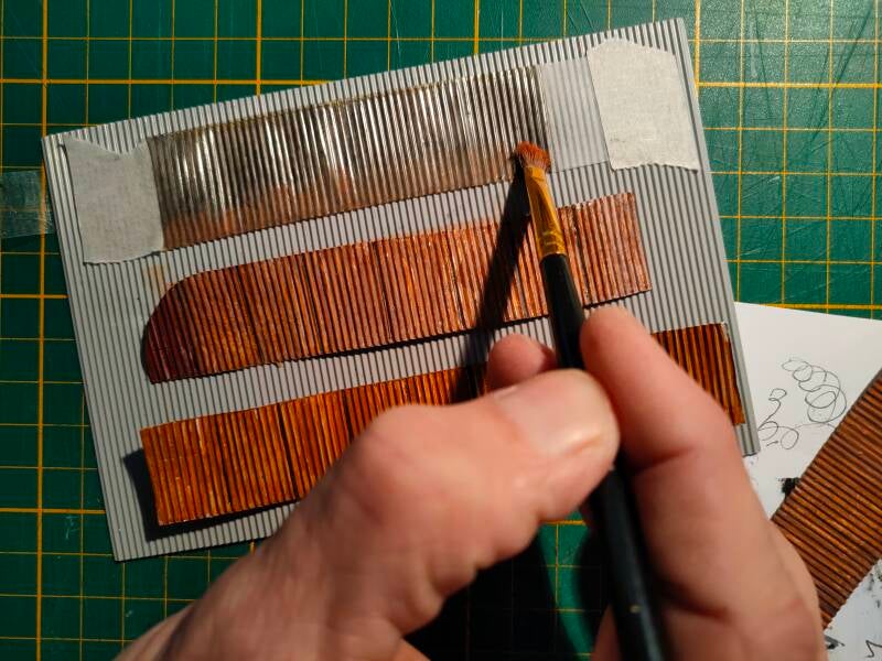 De golfplaat wordt op kleur gebracht met verschillende kleuren matte acrylverf: roestbruin, oranje en zwart, en daarna 'opgelicht' met een waasje bijna droog wit.